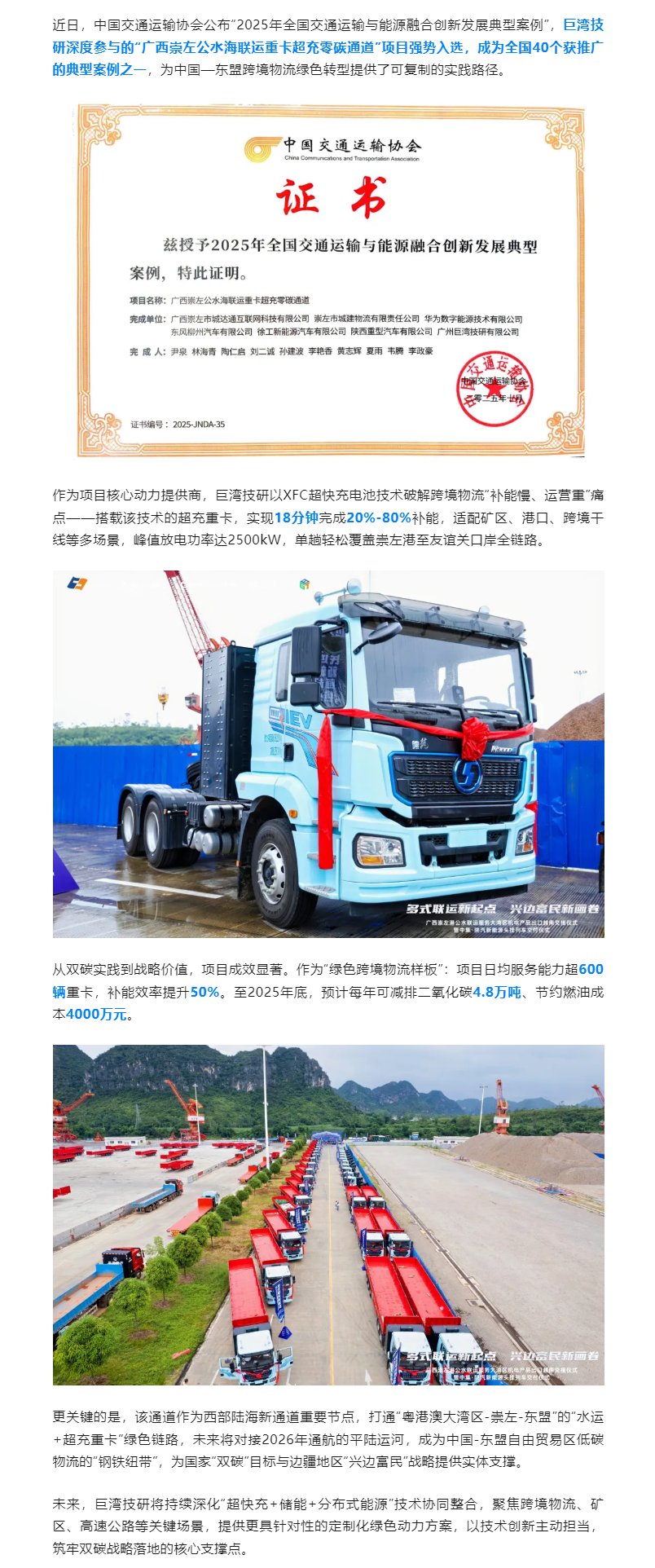 赋能“重卡超充零碳通道”,我会监事单位巨湾技研项目入选全国交能融合优秀案例!