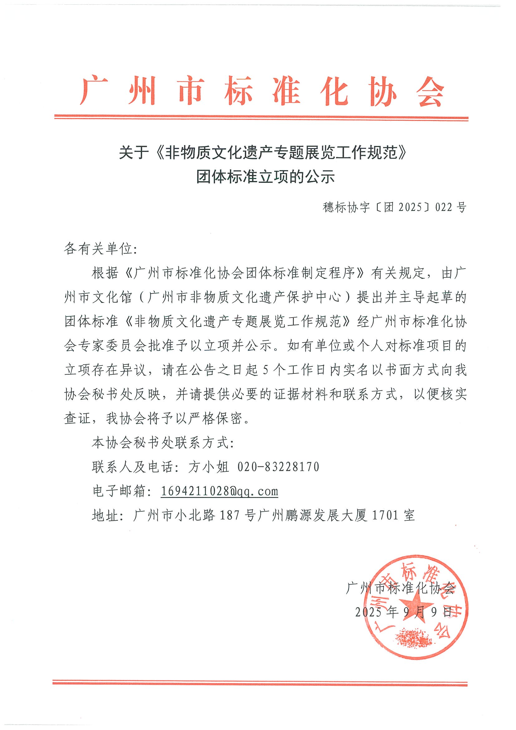 关于《非物质文化遗产专题展览工作规范》团体标准立项的公示