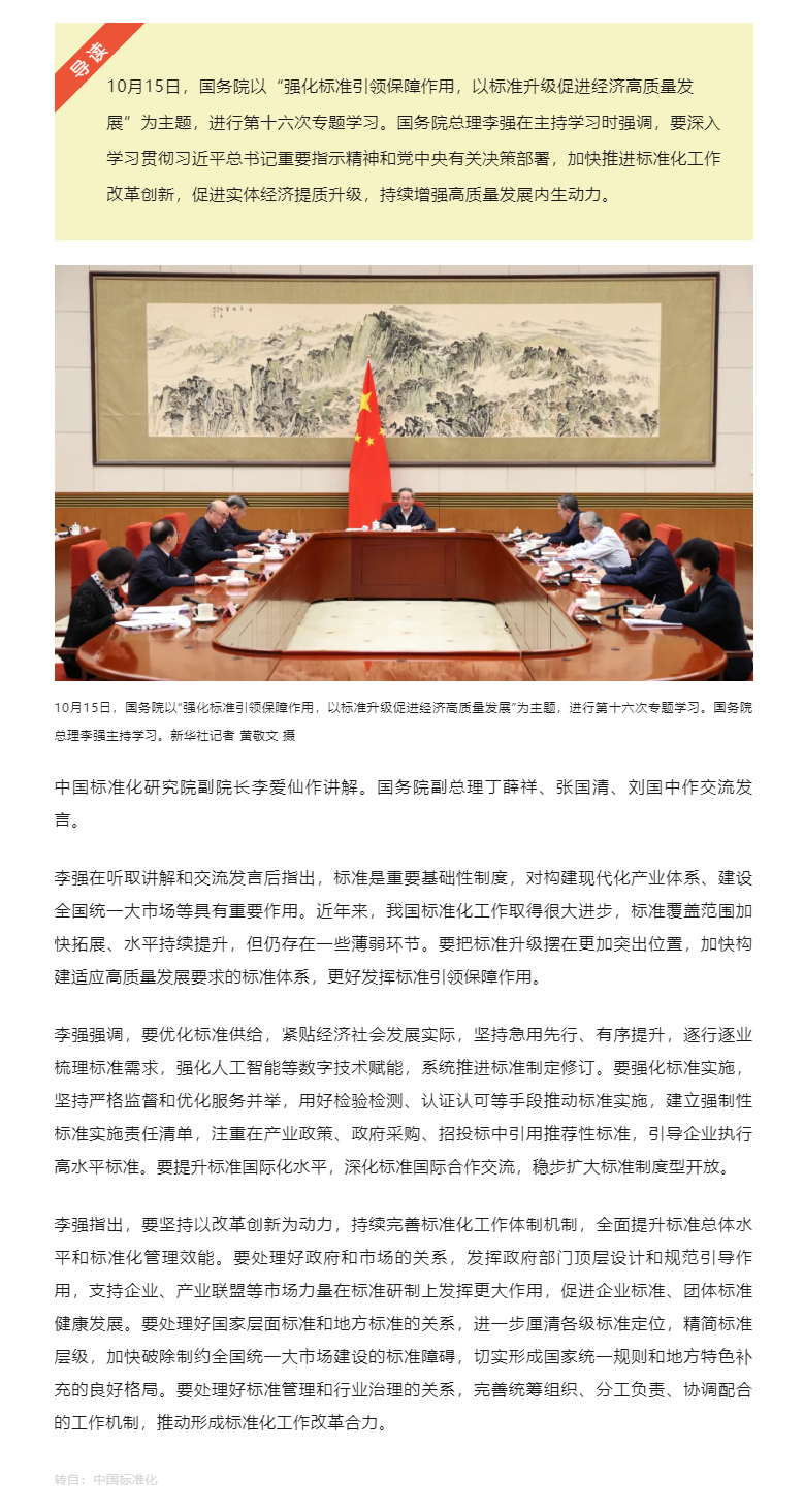 李强主持国务院“强化标准引领保障作用,以标准升级促进经济高质量发展”专题学习