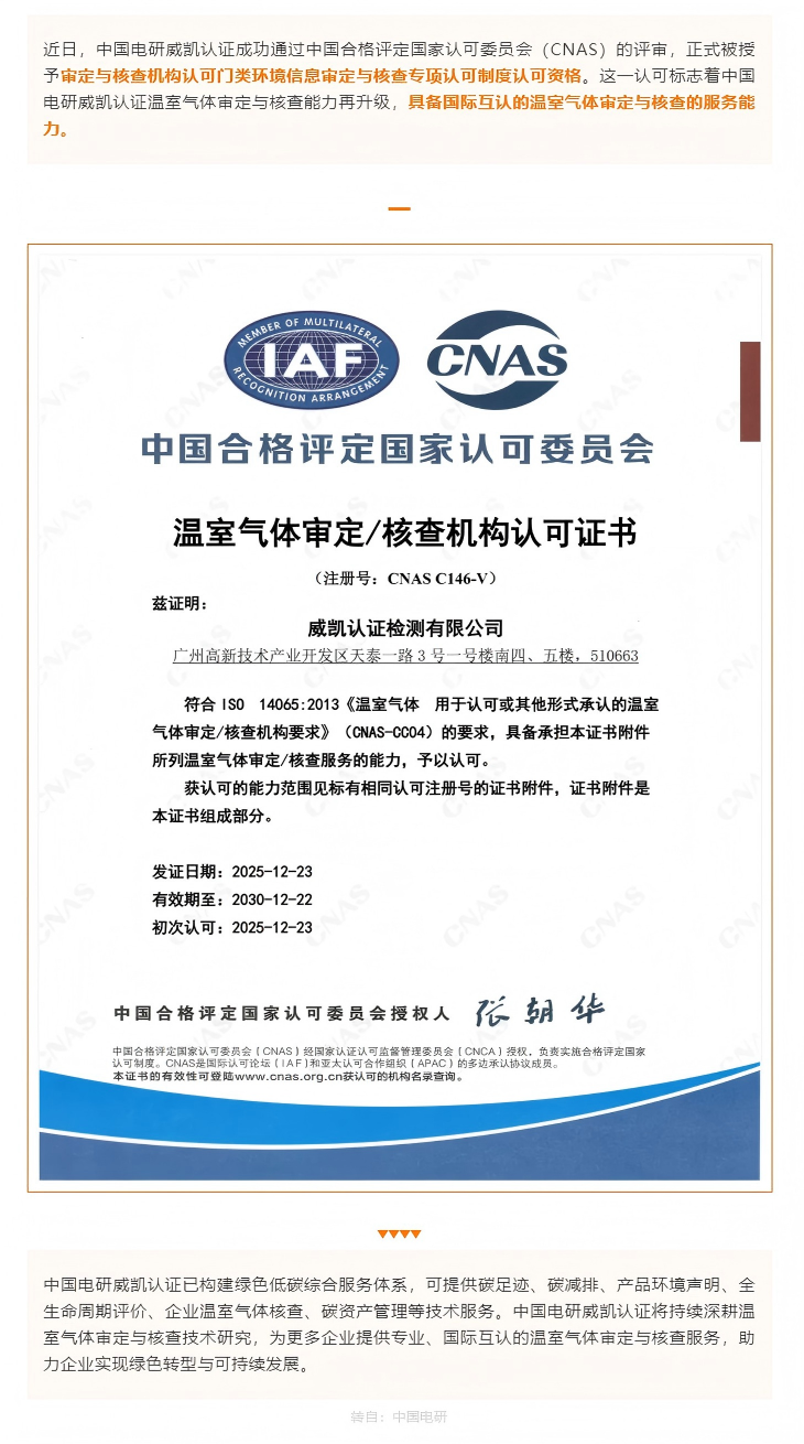 我会副理事长单位中国电研威凯认证获“温室气体审定与核查机构”认可