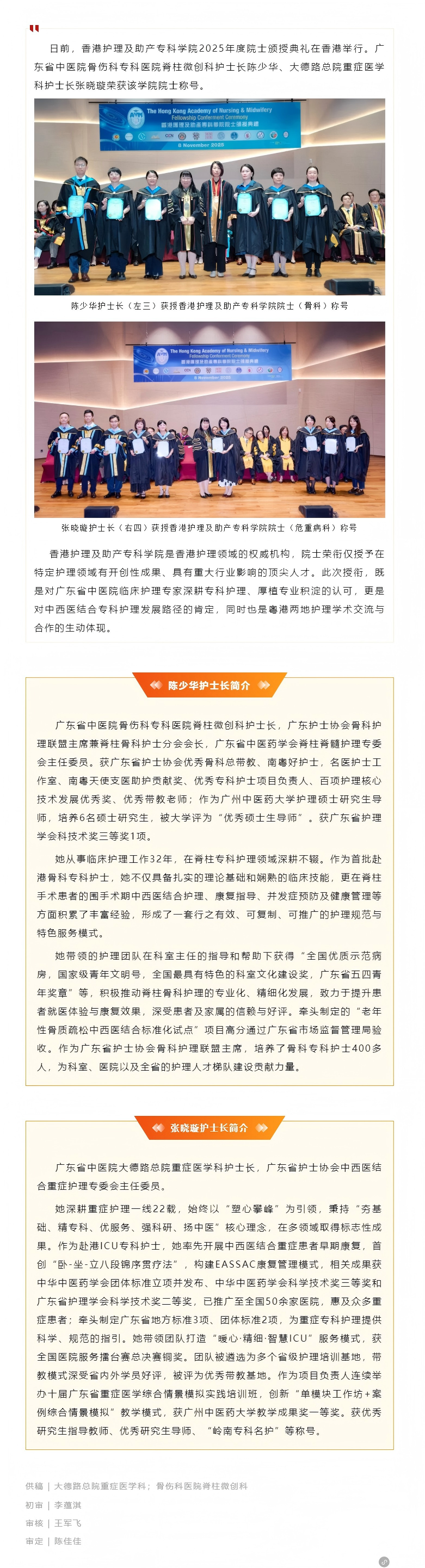 点赞!我会副理事长单位广东省中医院两位护士长获授香港院士称号