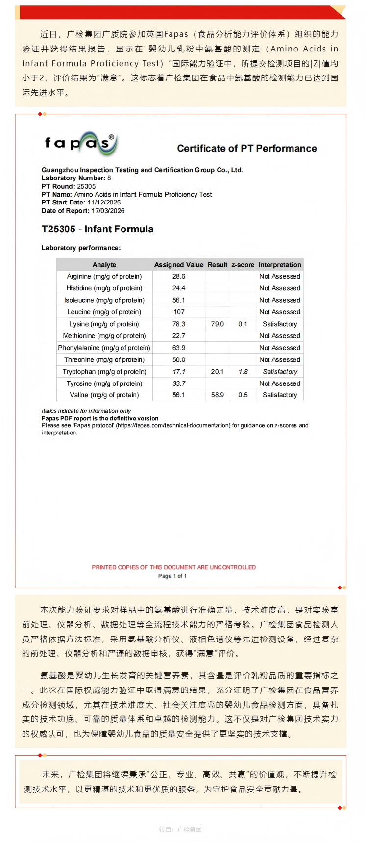 我会副理事长单位广检集团顺利通过Fapas国际能力验证,“婴幼儿乳粉中氨基酸测定”获“满意”结果