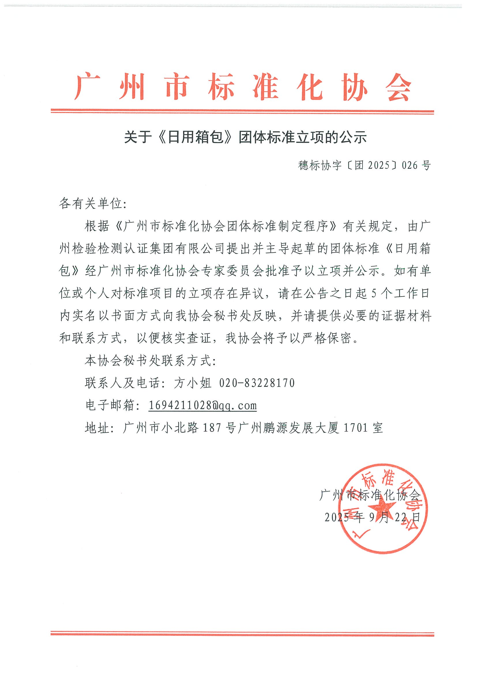 关于《日用箱包》团体标准立项的通知